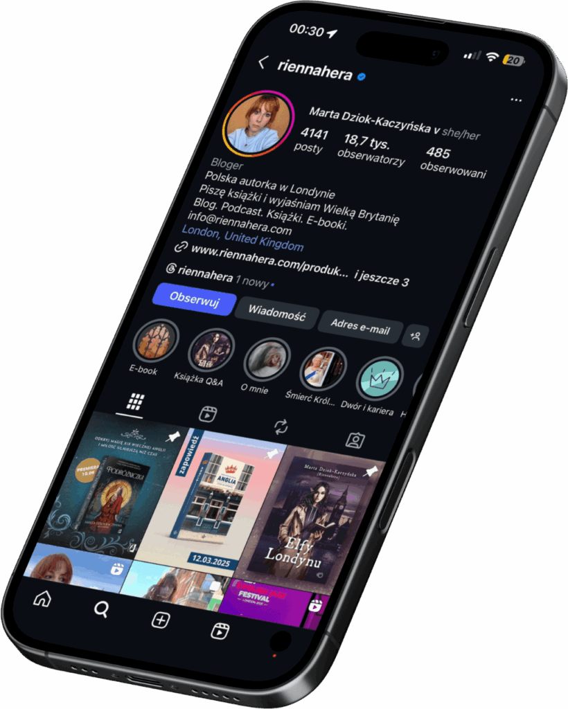 Dziś opowiadam historie – w książkach fantasy i o Anglii, na blogu, który prowadzę od 2008 roku, i w podcaście. Tworzę przestrzeń, w której spotykają się inspirujące rozmowy, wsparcie i humor.