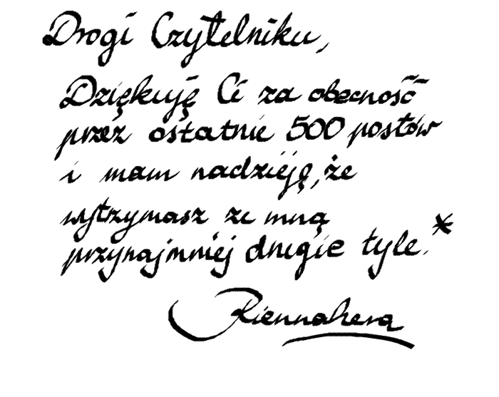 Nadejszla wiekopomna chwila. Nadszedł post pięćsetny. Z tej okazji, w podziękowaniu za 500 postów męki i cierpienia, same niespodzianki i ekskluzywny materiał. Na początek przemowa. W formie pisemnej. Następnie czas na materiał filmowy. Riennahera z pryszczem ma coś do powiedzenia. A na koniec czas na dmuchanie. Oczywiście faszionistki ciastek nie jedzą, co najwyżej fotografują, więc...